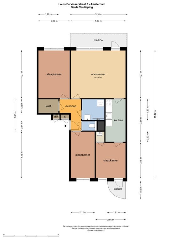 - De portiekflat heeft een woonoppervlakte van 71 m² en beschikt over 4 kamers, waarvan 3 slaapkamers;
