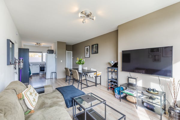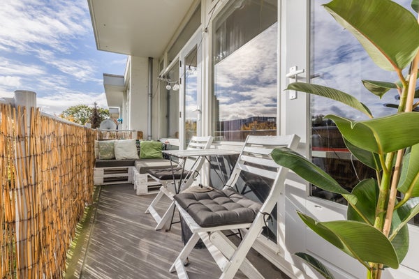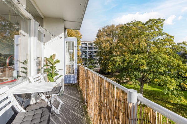 The spacious living room extends across the entire length of the property and has windows on both sides. Due to the layout and large amount of space, it feels more like a family home than an apartment! The living room provides access to the wide balcony overlooking the park-like surroundings behind the building. Two bedrooms also offer direct access to the balcony.