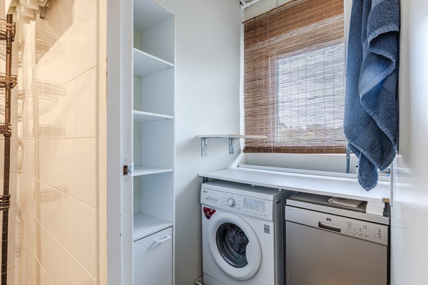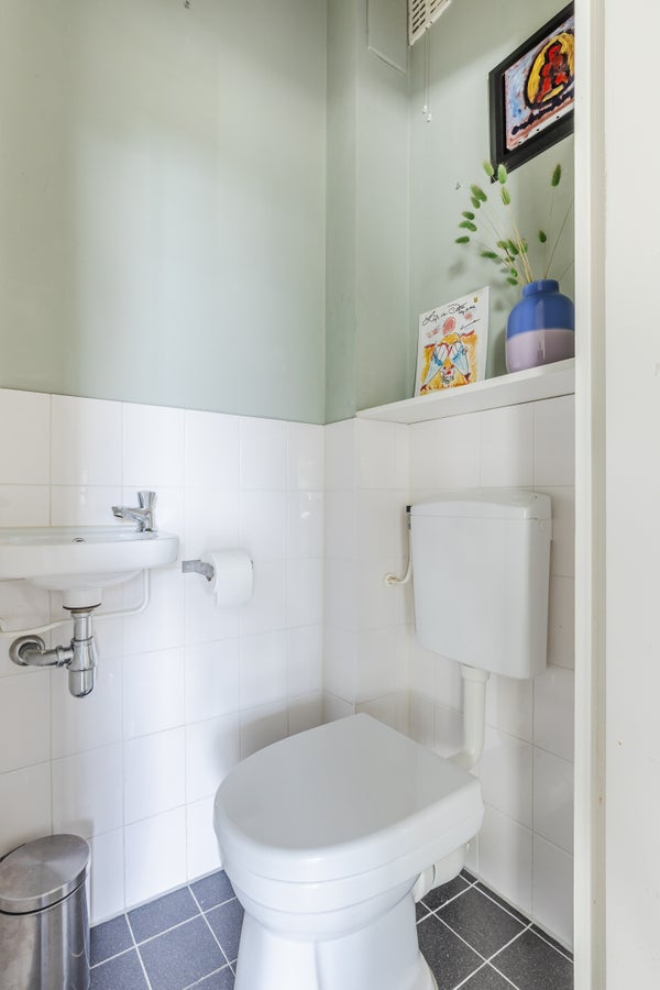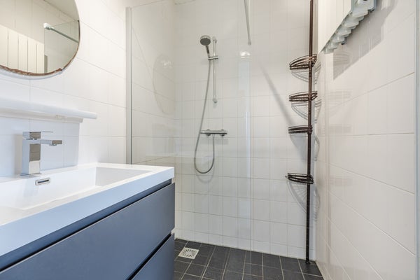 De moderne badkamer is voorzien van een wastafel met meubel en een inloopdouche. Vanuit de badkamer is er toegang tot een apart washok. Het toilet met fonteintje bevindt zich in een aparte ruimte.