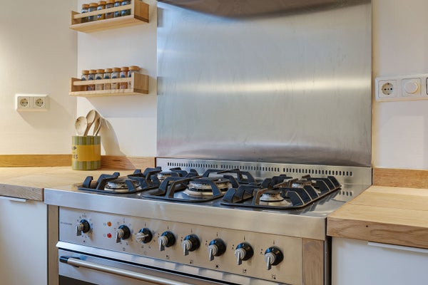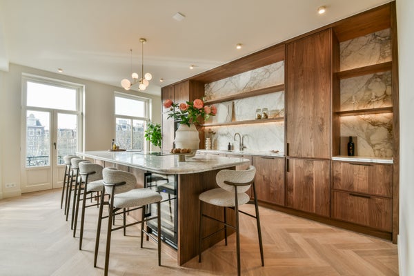 Aan de achterzijde bevindt zich de open woonkeuken, die in directe verbinding staat met de woonkamer. De keuken is uitgerust met moderne inbouwapparatuur, waaronder een 5-pits gasfornuis met grote oven, afzuigkap, vaatwasser en een royale Amerikaanse koel-/vriescombinatie. Er is volop ruimte voor een grote eettafel, ideaal voor lange diners met familie en vrienden.