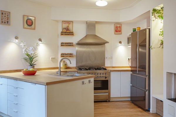 At the rear is the open-plan kitchen, which is directly connected to the living room. The kitchen is equipped with modern built-in appliances, including a 5-burner gas stove with large oven, extractor hood, dishwasher, and a spacious American fridge/freezer. There is plenty of room for a large dining table, ideal for long dinners with family and friends.