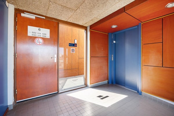 Via de afgesloten hoofdentree met intercomsysteem bereikt u met de lift of trap de zesde verdieping.