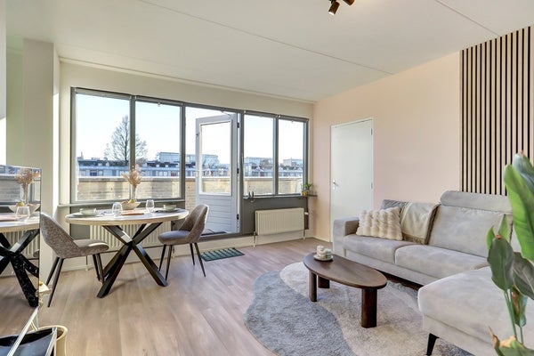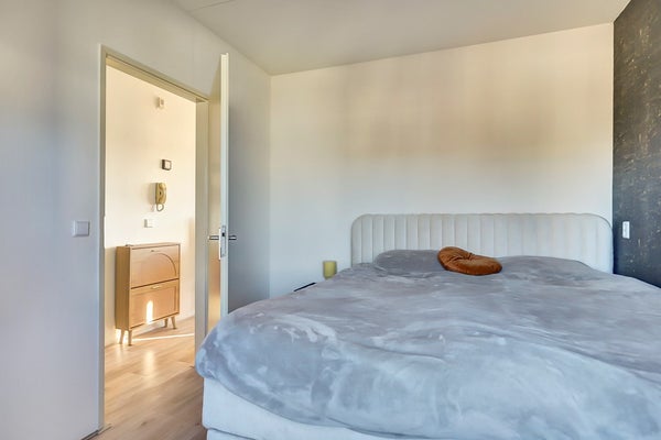 Upon entering you immediately enter the bright living room, which flows seamlessly into a modern open kitchen, perfect for both daily use and for receiving guests. The two spacious bedrooms are not adjacent to each other, giving the whole a practical and nice layout. The bathroom is large by Amsterdam standards and is in modern condition. Beautiful dark tiles, a walk-in rain shower with a glass shower wall. Toilet, bidet, radiator and a washbasin with large mirror. This apartment has been repainted in 2024 and has a new PVC floor which is very practical with the large balcony -terrace. This attractive balcony terrace of no less than 20m2! The perfect place for a cup of coffee in the morning sun or a relaxing glass of wine in the evening with friends, nicely around the BBQ. And do realize that there is no higher building in the surrounding then this apartment complex, so a lot of sun if its shining.