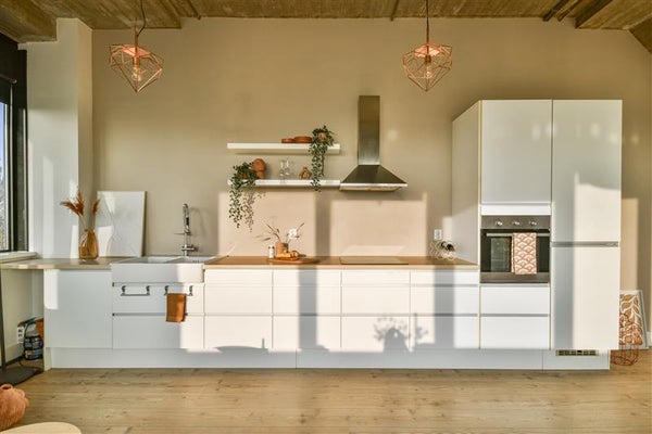 - Moderne open keuken, voorzien van inbouwapparatuur en een strakke afwerking.