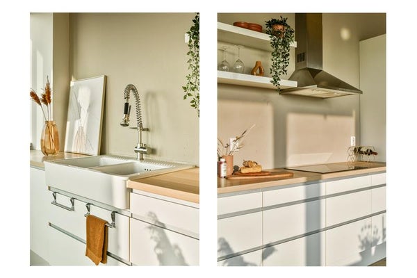 De open keuken is volledig uitgerust met inbouwapparatuur, zoals een kookplaat, afzuigkap, koelkast, vaatwasser en een oven. De neutrale, strakke afwerking zorgt ervoor dat de keuken perfect aansluit op het interieur en een prachtige, praktische plek vormt om te koken. Of je nu een snelle maaltijd wilt bereiden, of iets uitgebreids op tafel wilt zetten – hier heb je alles bij de hand. De badkamer bevat een douche, een wastafel en een toilet. Alles is in goede staat, zodat je hier direct zorgeloos kunt wonen.