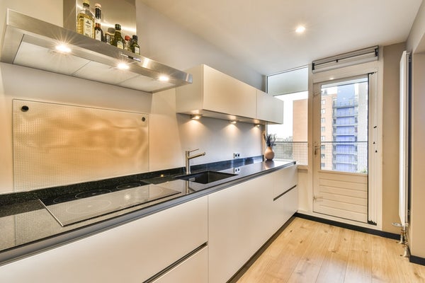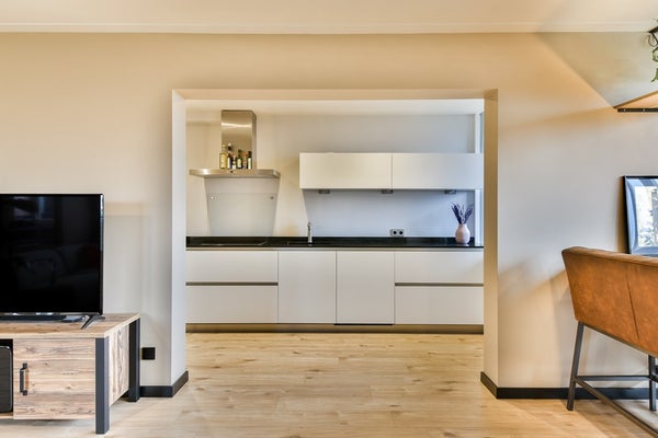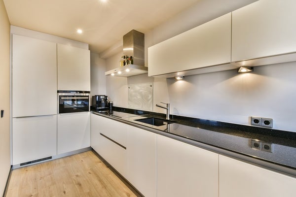 De keuken is modern uitgevoerd met witte kasten en een antracietkleurig composiet werkblad en is voorzien van een inductiekookplaat, afzuigkap, ingebouwde oven, Siemens vaatwasser en een koelkast. Een losse vriezer, geplaatst in de kast naast de keuken, kan desgewenst worden overgenomen. Vanuit de keuken is er directe toegang tot het balkon.