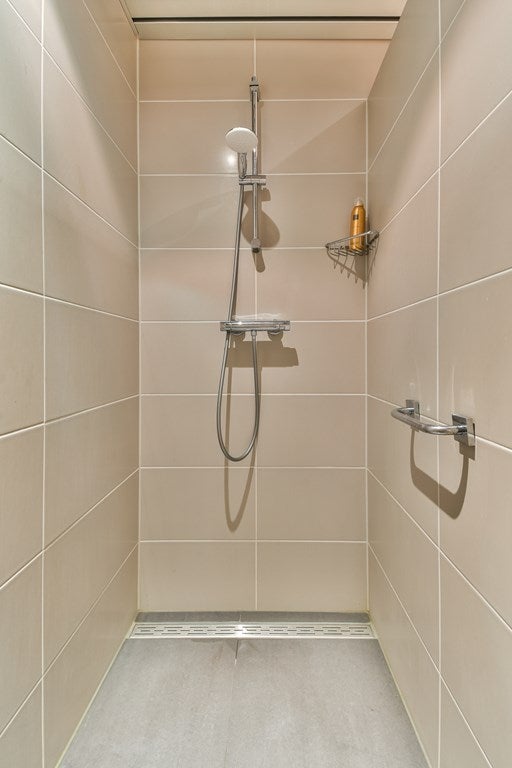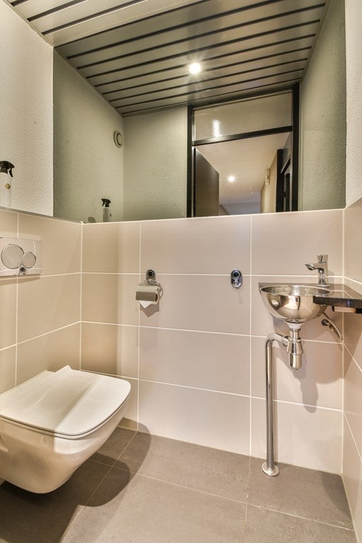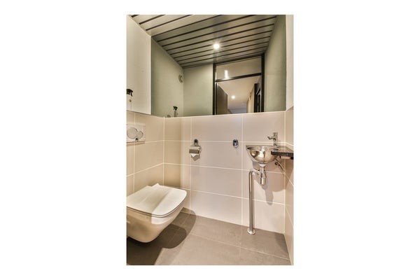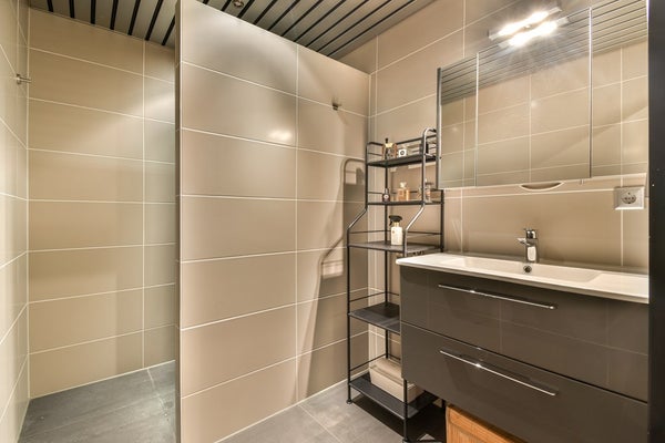 De badkamer is afgewerkt met moderne tegels in aardse tinten en beschikt over een inloopdouche, een extra brede wastafel met spiegelkast en bergruimte onder de wastafel. Het toilet is separaat en voorzien van een eigen wastafel. Alle sanitaire ruimtes zijn volledig betegeld.