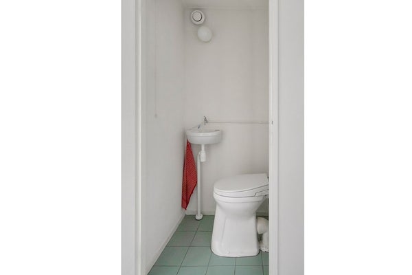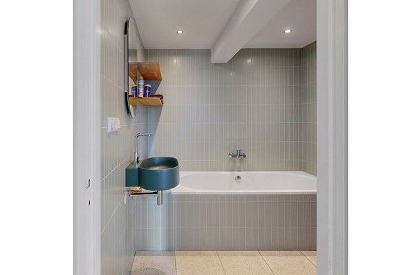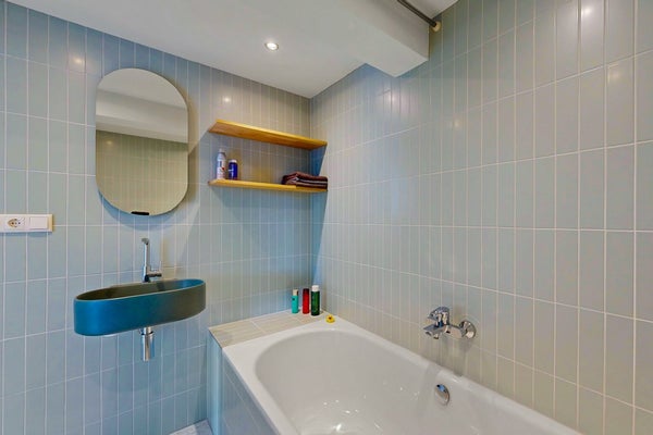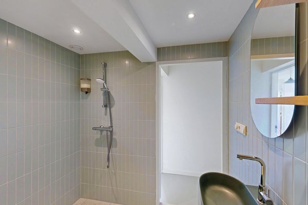 De badkamer is strak, fris en helemaal van nu. De hippe lichtgroene tegeltjes geven de ruimte een rustige en moderne uitstraling en zorgen voor een lichte sfeer. Je hebt de keuze tussen een fijne inloopdouche en een ligbad. De wastafel met moderne kraan en ronde spiegel maken het geheel af. De houten plankjes zorgen voor praktische opbergruimte.