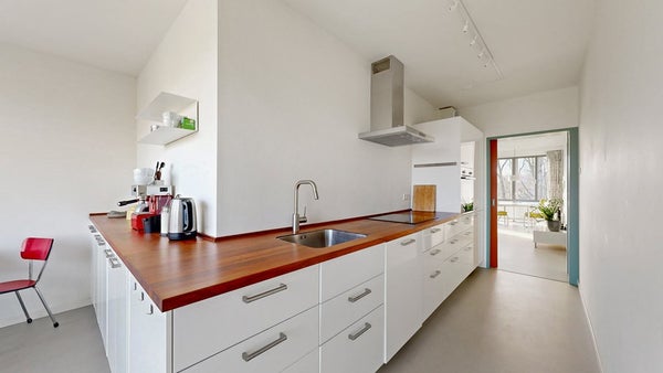 De woonkamer staat in open verbinding met de keuken, die je desgewenst kunt afsluiten met een schuifdeur. De keuken is een echte eyecatcher en loopt speels de hoek om, waardoor wonen, koken en eten hier één logisch geheel vormen. De opstelling voelt open en ruim, met veel werkblad en kastruimte. Het hardhouten aanrechtblad steekt mooi af tegen de hoogglans witte fronten en maakt de keuken warm en uitnodigend.