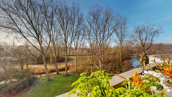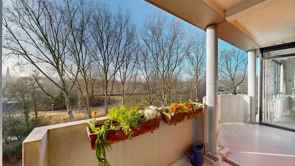 De ruime en lichte woonkamer voelt direct prettig aan. Je kijkt vrij uit over groen en hebt, net als vanuit twee van de drie slaapkamers, toegang tot het zonnige balkon op het zuiden. Een fijne plek waar je de hele dag van de zon geniet.