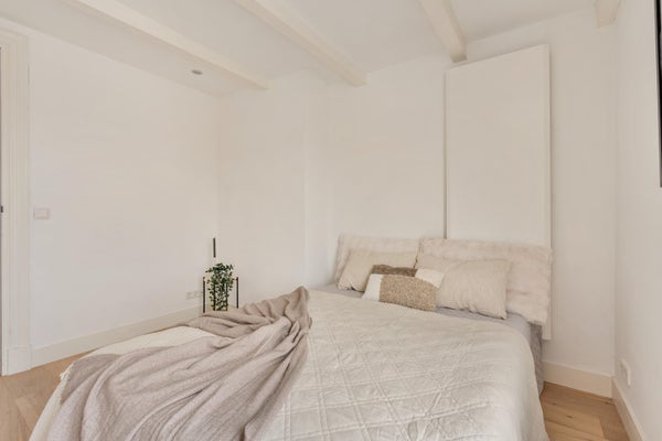 Aan de achterzijde van het appartement ligt de rustige slaapkamer. Deze kamer is heerlijk stil en biedt genoeg plek voor een tweepersoonsbed en een kledingkast. Door de ligging aan de achterzijde slaap je hier ver weg van het levendige straatgeluid van de stad.