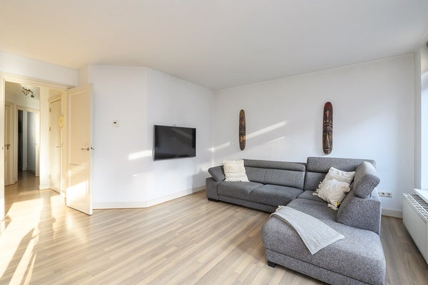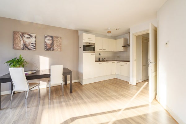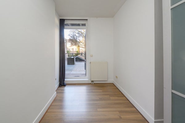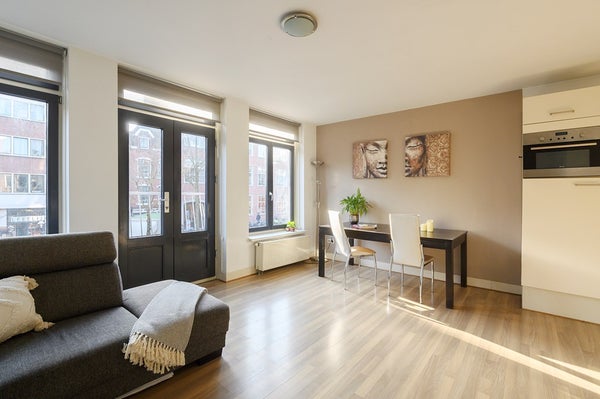 De lichte woonkamer met open keuken vormt het hart van de woning en biedt een prettige, ruimtelijke leefomgeving. Aan de voorzijde zorgen grote ramen met een Frans balkon voor veel daglicht en een levendig uitzicht op de straat.