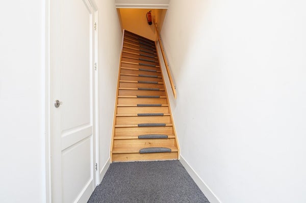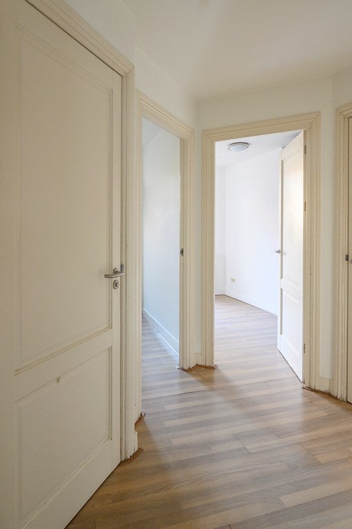 Entree, gemeenschappelijke en brede trapopgang naar de eerste verdieping waar zich de toegangsdeur naar het appartement bevindt. Via deze deur komt u in de hal van waaruit alle vertrekken bereikbaar zijn.