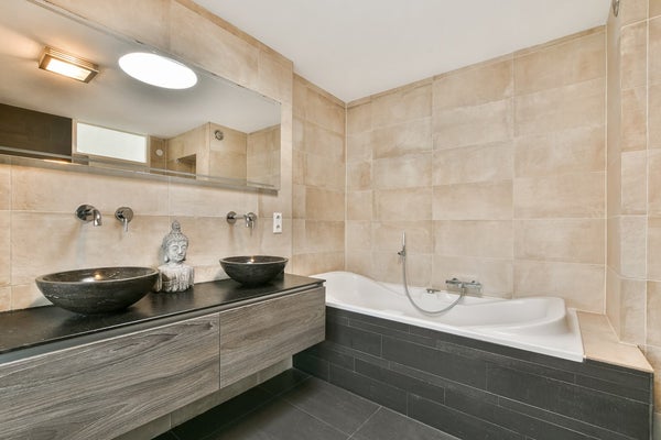Luxe badkamer met ligbad (bubbelbad), inloopdouche en breed wastafelmeubel met twee kommen.