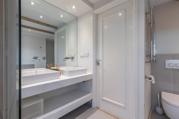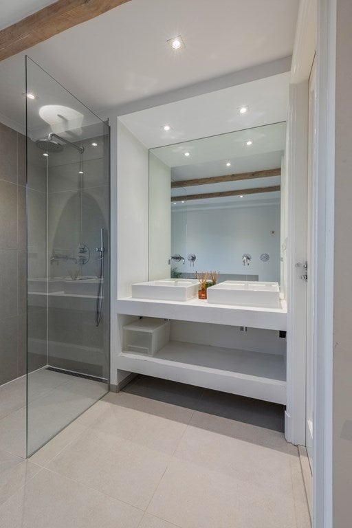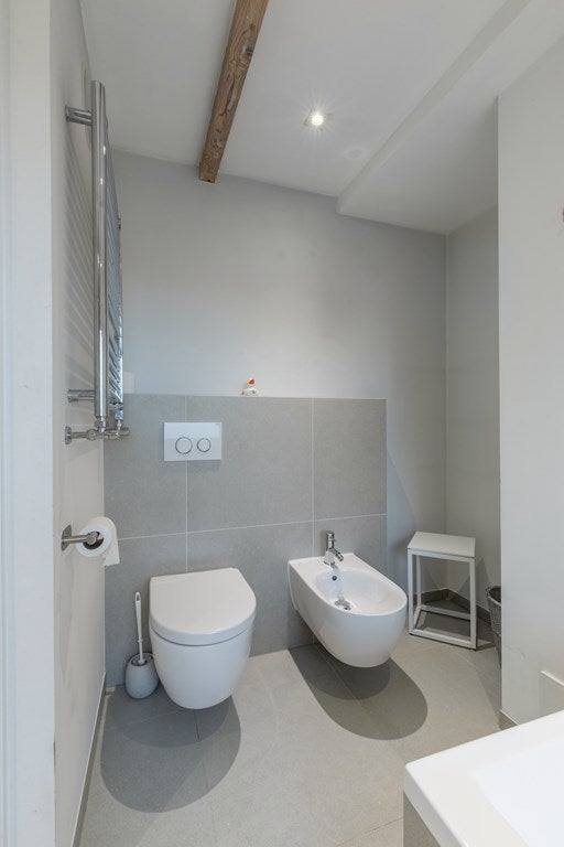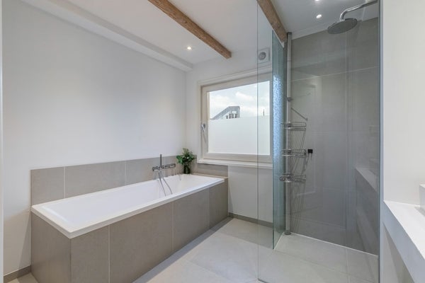 De luxe badkamer is voorzien van vloerverwarming, een ruim ligbad, bidet, een (2e) toilet, handdoekradiator, wastafelmeubel met dubbele wasbak en een ruime inloop regendouche.