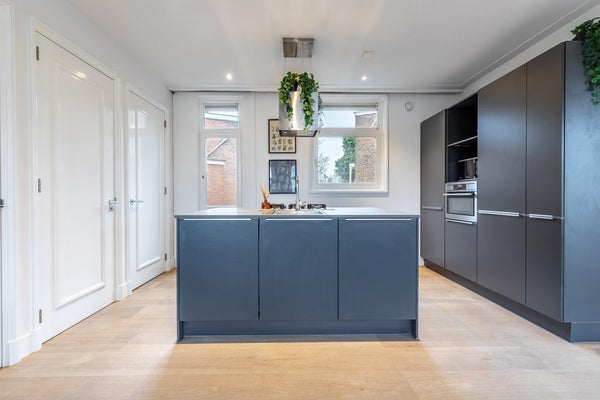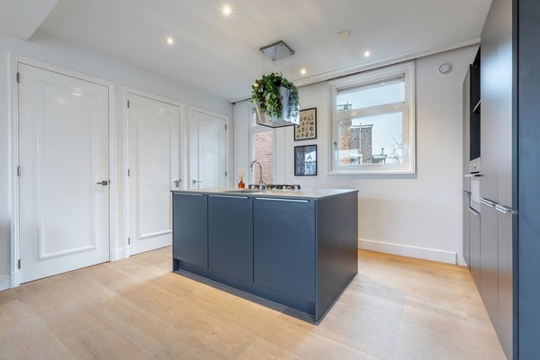 De moderne open keuken heeft een groot kookeiland met spoelbak en is voorzien van alle benodigde inbouwapparatuur: vaatwasser, koelkast, vriezer, combi-oven en een gasfornuis met afzuigkap. Vanuit de keuken kijk je uit over de rustige binnentuinen. Een ruim balkon aan deze zijde behoort wellicht tot de mogelijkheden voor nader onderzoek.