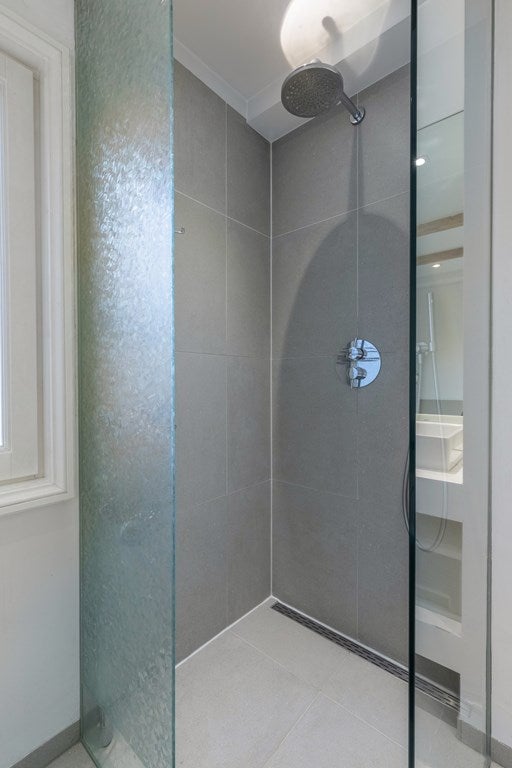 The luxurious bathroom features underfloor heating, a spacious bathtub, a bidet, a second toilet, a towel radiator, a double sink vanity, and a walk-in rain shower.