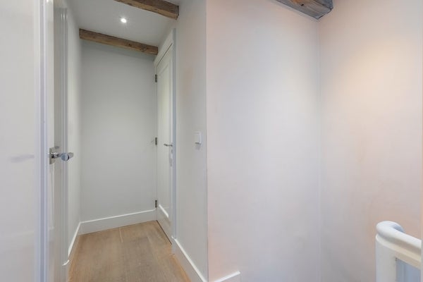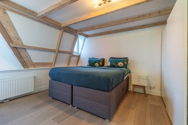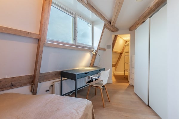 Via een kleine overloop heb je toegang tot twee sfeervolle slaapkamers, beide deels onder de kap met zichtbare houten balken voor een warme uitstraling. Eén slaapkamer is ruim opgezet; de andere beschikt over extra bergruimte.