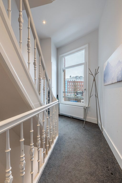 De lage vensterbanken brengen het buitenleven naar binnen en zorgen voor een panoramisch uitzicht over de grachten. Twee dubbele openslaande deuren geven toegang tot een smal balkon aan de voorzijde.