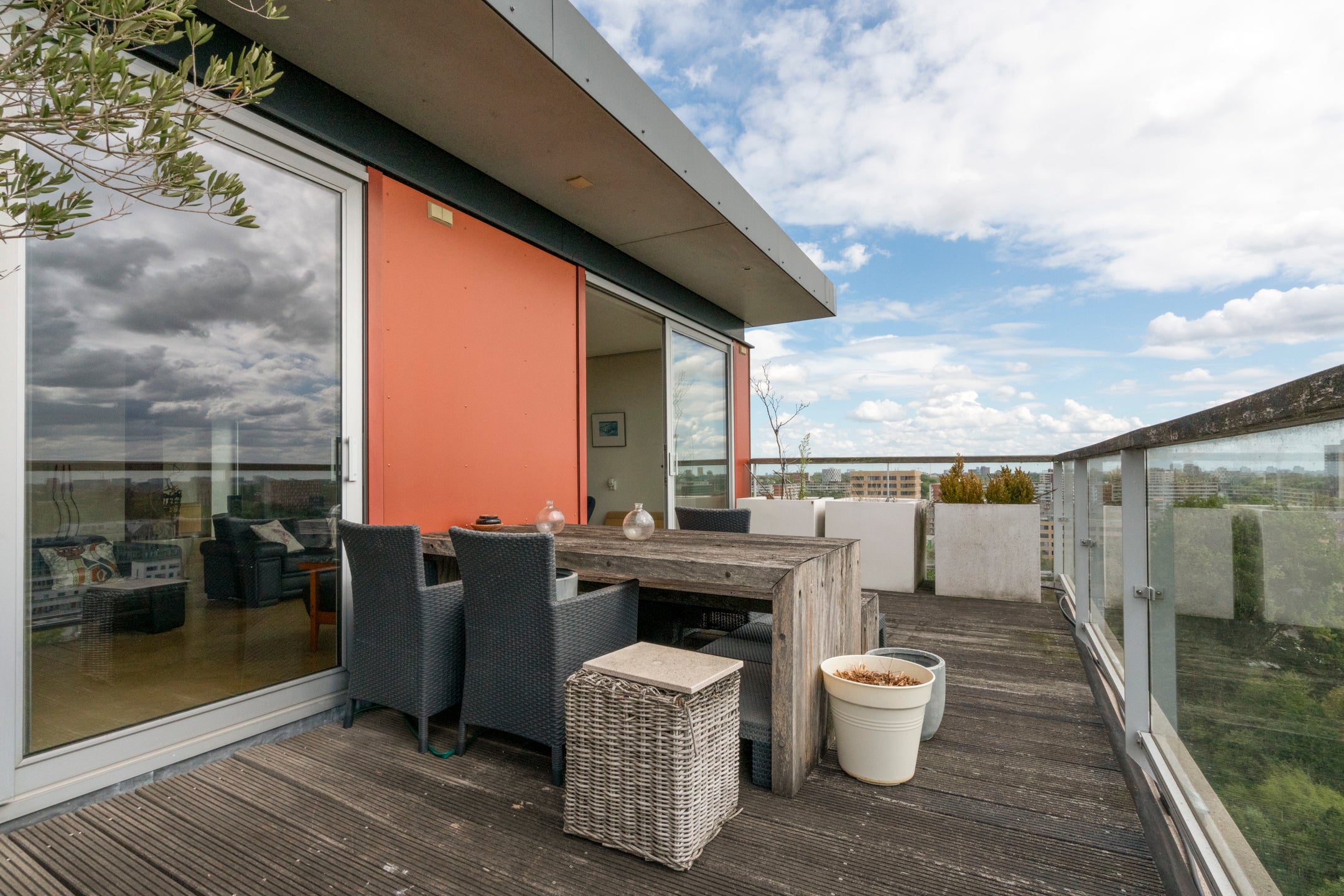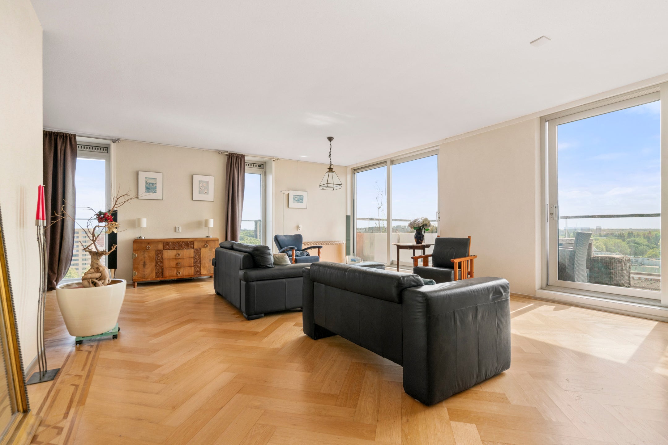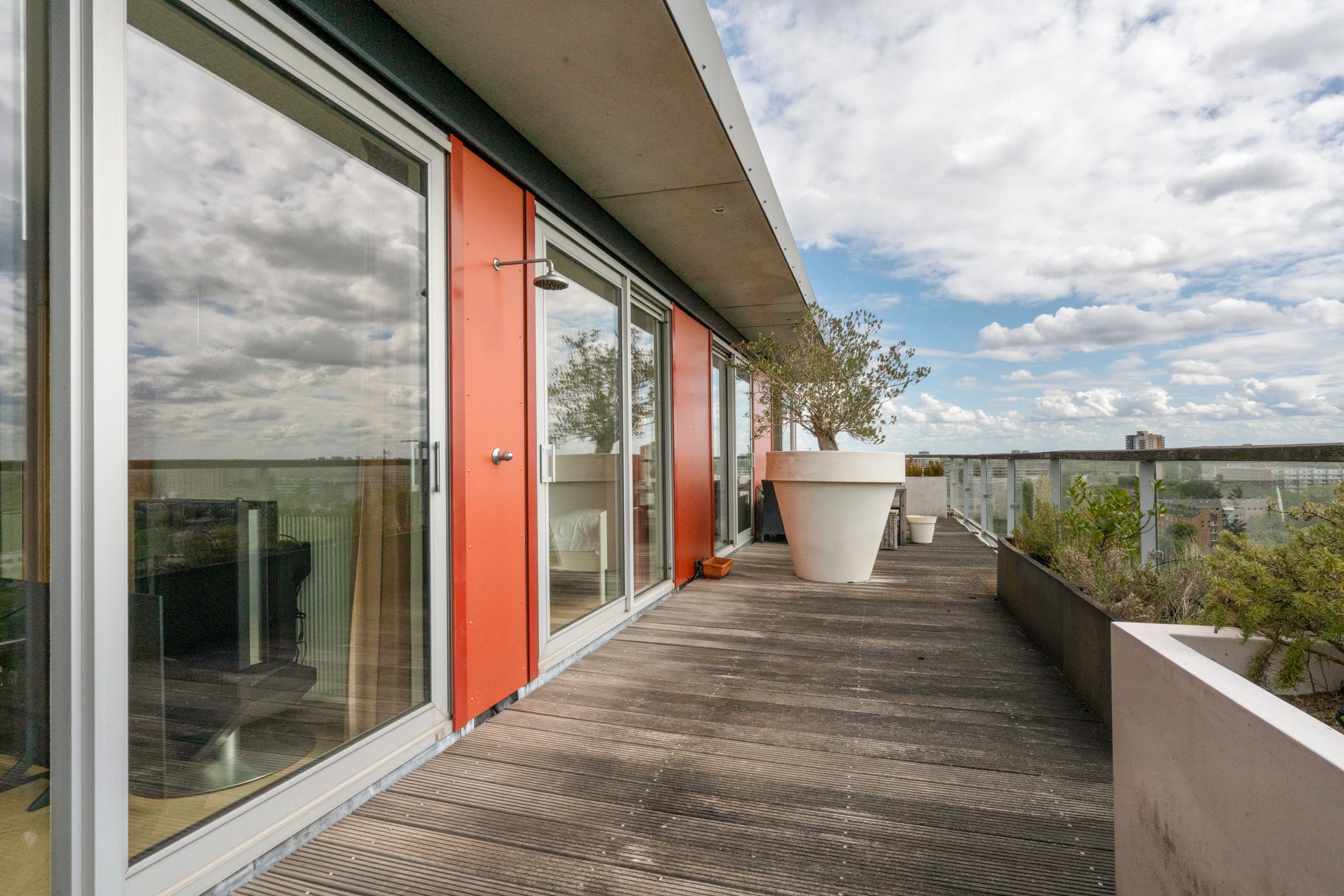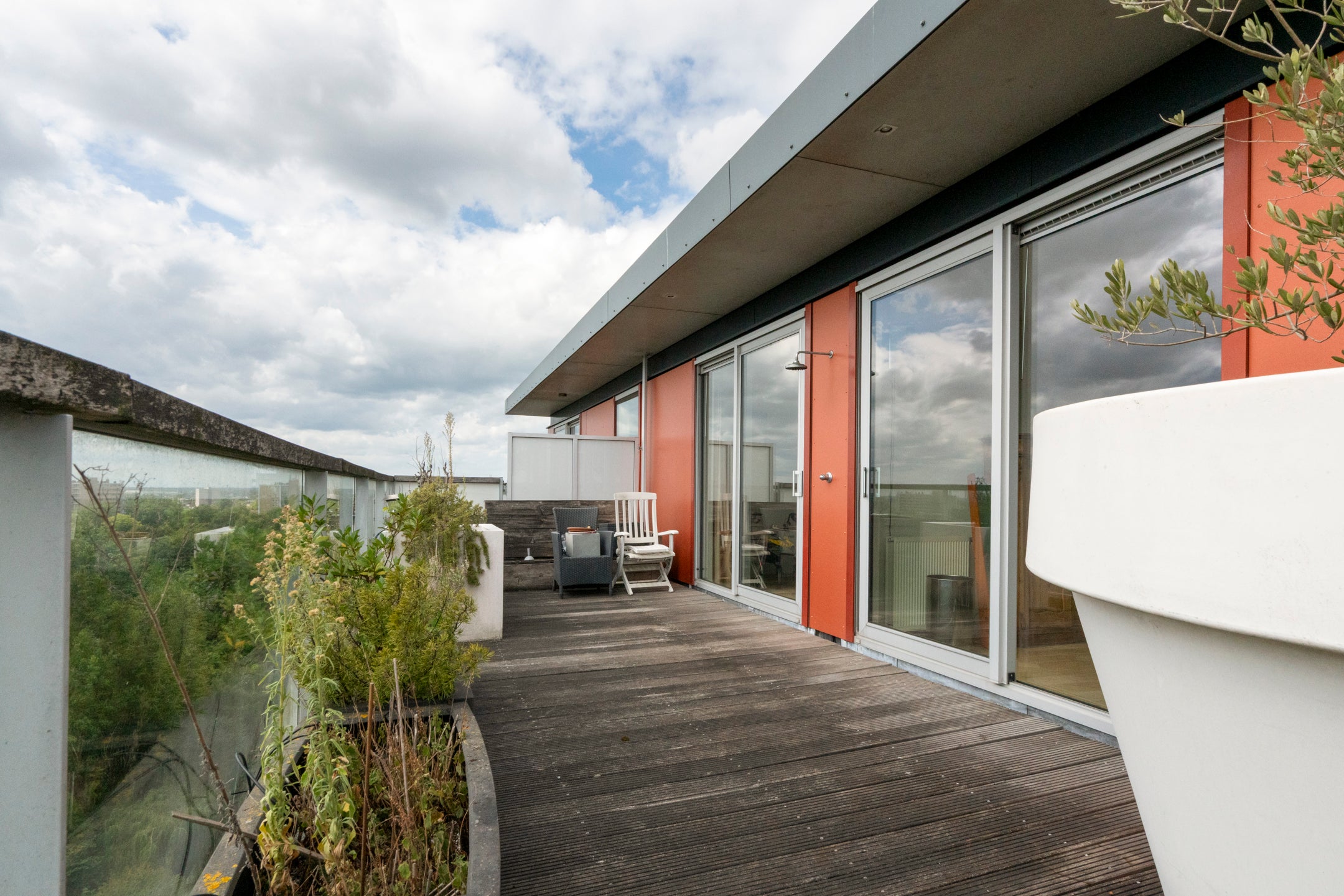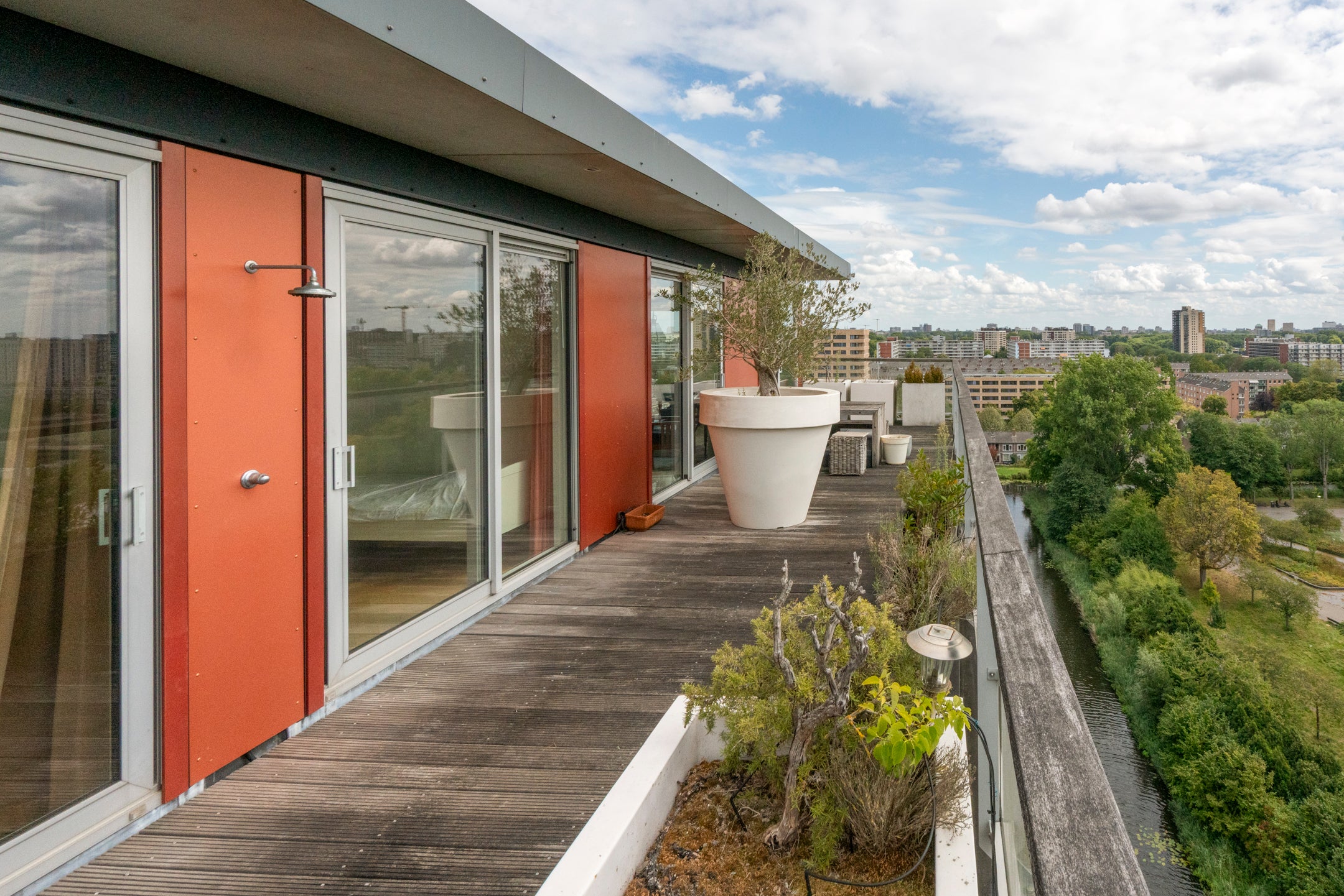 Deze ruime 3-kamer-penthouse van ongeveer 133 m² bevindt zich op de 12e verdieping en heeft een zonnig dakterras van 38 m² op het zuiden. De riante woonkamer is verdeeld in een zitgedeelte met twee schuifpuien naar het dakterras en een eetgedeelte dat aansluit op de open keuken, die goed verlicht wordt door extra zijramen met Franse balkons. De woning is luxe afgewerkt, inclusief een fraaie eiken visgraat parketvloer. Daarnaast beschikt het over een eigen parkeerplaats en fietsenberging in de onderbouw. De locatie biedt panoramisch uitzicht en een combinatie van stedelijk gemak en rust, met winkels en recreatiemogelijkheden in de nabijheid. Tram- en busverbindingen zijn praktisch voor de deur, waardoor de bereikbaarheid uitstekend is. De servicekosten van de VvE bedragen € 208,70 per maand.