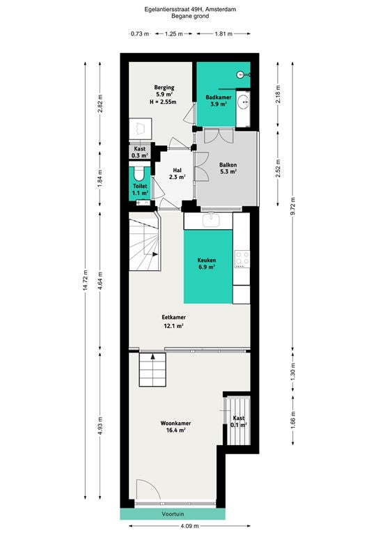 - De benedenwoning heeft een woonoppervlakte van 91 m² en beschikt over 3 kamers, waarvan 2 slaapkamers;