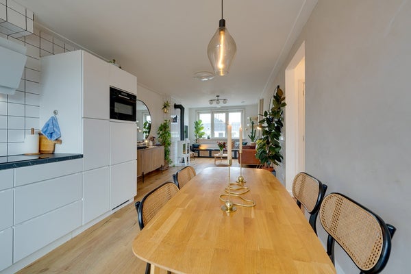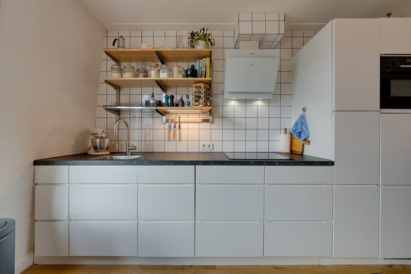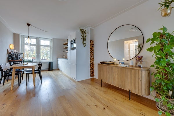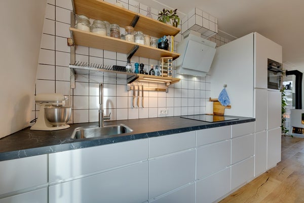 Aan de achterzijde ligt de moderne open keuken (2018), uitgerust met hoogwaardige inbouwapparatuur: een inductiekookplaat, vaatwasser, koel-vriescombinatie, combi-oven en een Quooker. Het stijlvolle aanrechtblad en de ruime opbergmogelijkheden maken de keuken compleet. Vanuit hier heb je toegang tot het ruime balkon op het zuidwesten – perfect voor zonnige middagen, avonden en gezellige borrels.