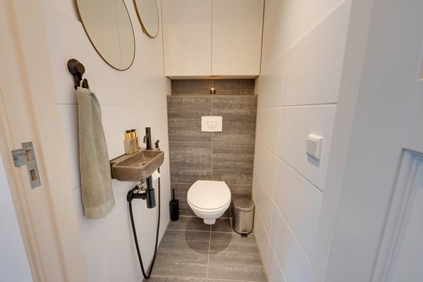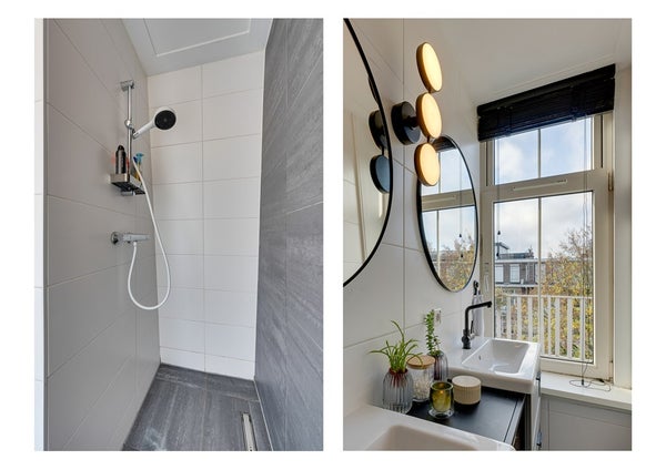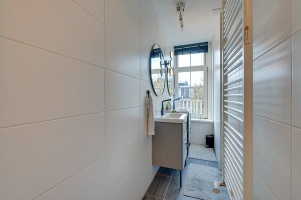De moderne badkamer is centraal gelegen en luxe uitgevoerd met een ruime inloopdouche met thermostaatkraan en een dubbele wastafel met meubel en spiegels. Het eigentijdse tegelwerk geeft de ruimte een stijlvolle uitstraling.