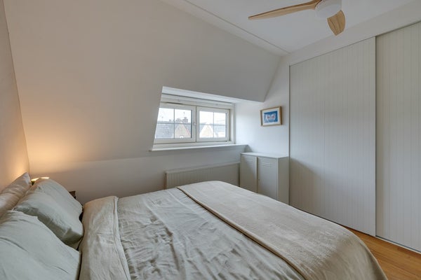 De hoofdslaapkamer bevindt zich aan de voorzijde en beschikt over een inbouwkast. De tweede slaapkamer – momenteel in gebruik als werk- en logeerkamer – ligt aan de achterzijde.