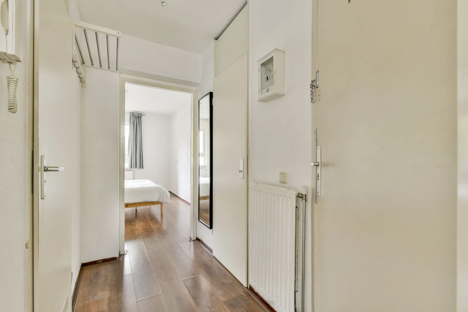 De indeling omvat een centrale entree met brievenbussen, een hal met toegang tot alle vertrekken, een slaapkamer aan de achterzijde met toegang tot een balkon en een ruime woonkamer met een Frans balkon. De moderne keuken is voorzien van inbouwapparatuur. De badkamer biedt een douchehoek, toilet en wastafel.”} {