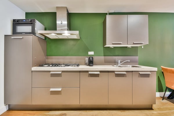 Woonkamer is gelegen aan de voorzijde van het appartement, welke is voorzien van een prachtige raampartij met zicht op de nieuw fraai aangelegde straat. De compleet open keuken is voorzien van luxe inbouw apparatuur (4-pits gasfornuis met afzuigkap, oven, koel/vries combinatie en vaatwasser)