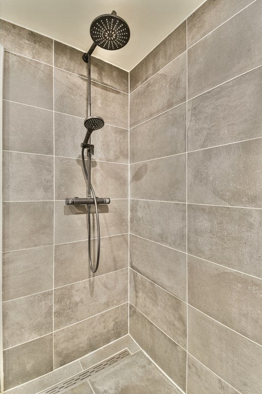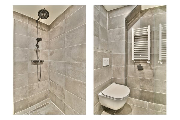 Tegenover de keuken is de badkamer met inloopdouche, toilet en wastafelmeubel.