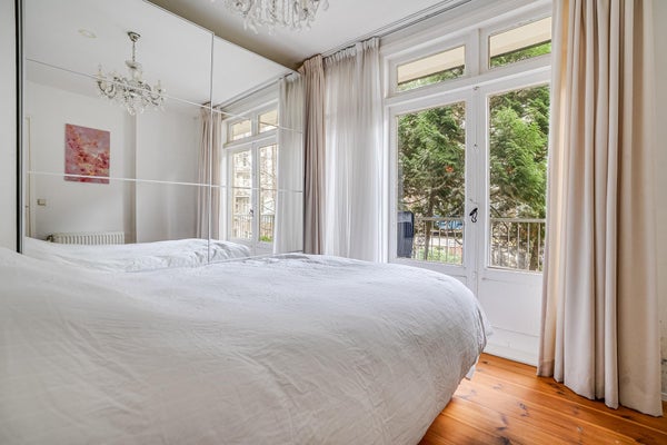 De royale slaapkamer is gelegen aan de rustige achterzijde van het appartement. Via openslaande deuren heeft u toegang tot het zonnige terras van ruim 9 m², gelegen op het zuidwesten, een heerlijke plek om tot in de avond van de zon te genieten.