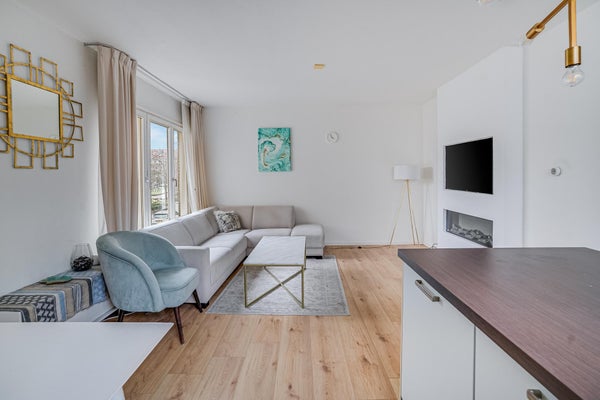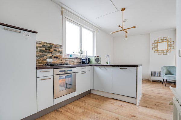 Aan de voorzijde bevindt zich de lichte en ruime woonkamer, met voldoende ruimte voor zowel een comfortabele zithoek als een eethoek. De woonkamer staat in open verbinding met de net uitgevoerde L-vormige woonkeuken, voorzien van diverse inbouwapparatuur, waaronder een 4-pits gasfornuis, oven, vaatwasser, spoelbak en koel-vriescombinatie. Dankzij de grote raampartijen geniet u hier van een prettige lichtinval gedurende de dag.