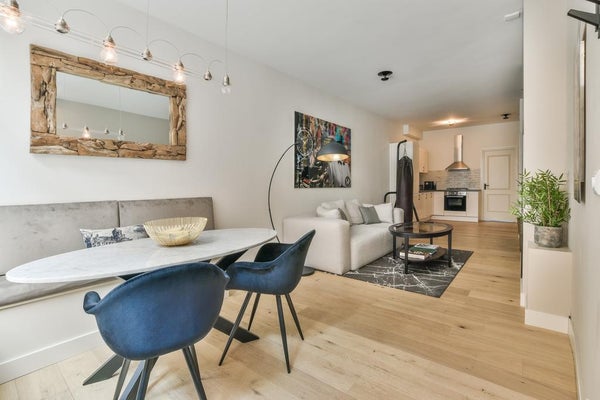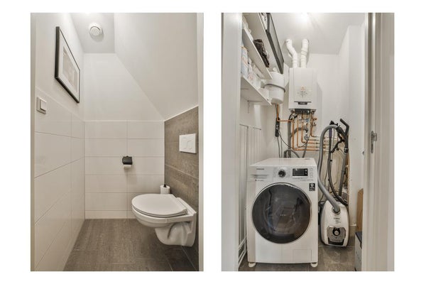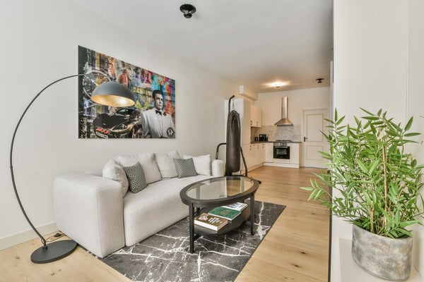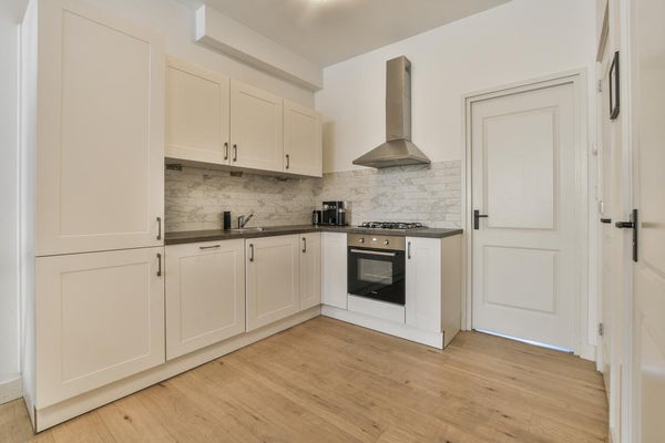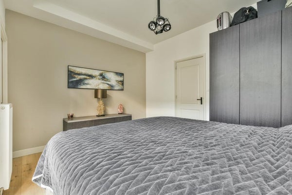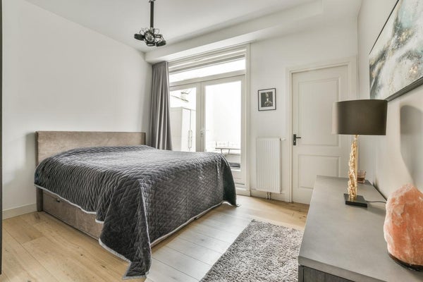 The apartment was renovated in 2018, partly in 2019 and equipped with wooden floors, an open kitchen with all appliances, new piping, luxury bathroom with walk-in shower and washbasin, a separate toilet and a storage room with central heating system and washing machine connection. A spacious living room with a 2.85 m high ceiling, attractive (drainless, electric) fireplace and sleek ceilings and walls. The beautiful details such as the radiator housing, custom-made bench at the dining table and the design light spots in the ceiling finishes it off. At the rear is the spacious bedroom, with enough space for a large bed and cupboards. 2 large patio doors lead to the patio, located on the northwest side.