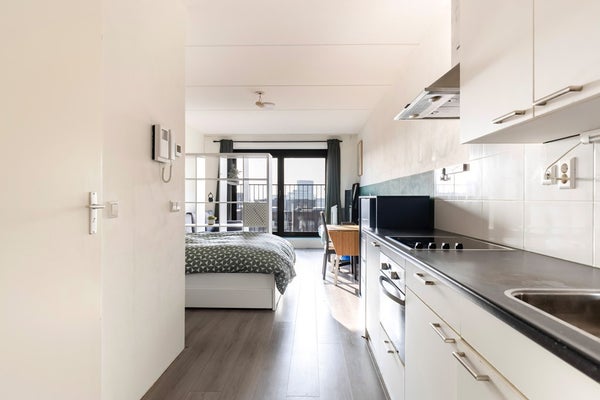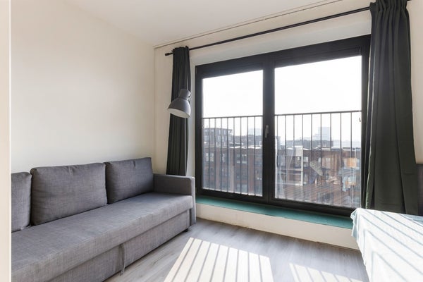Uitzonderlijk studio-appartement op het zuiden, gelegen op de 7e etage van het geliefde appartementencomplex Villa Mokum in het Amstelkwartier.