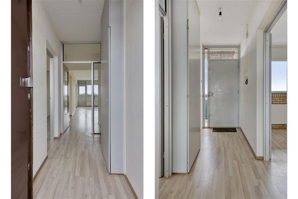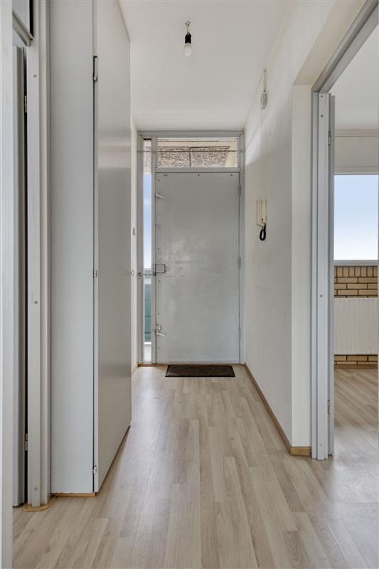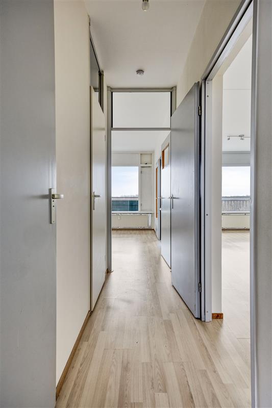 Via de entree kom je in de hal die toegang geeft tot de gesloten keuken aan de voorzijde. Vanuit de hal betreed je de lichte en ruime woonkamer met toegang tot het zonnige balkon op het zuiden; perfect om van zowel de zon als het uitzicht te genieten. Aangrenzend aan de woonkamer bevindt zich één van de slaapkamers. Via de gang bereik je het separate toilet, een badkamer en nog een tweede slaapkamer aan de voorzijde.