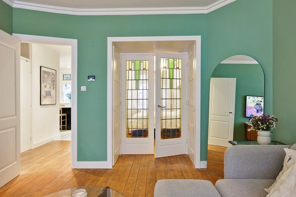 Door het gehele appartement liggen houten vloerdelen, en de combinatie van moderne afwerking en originele details – zoals glas-in-loodramen – maakt dit appartement bijzonder sfeervol en karakterestiek.
