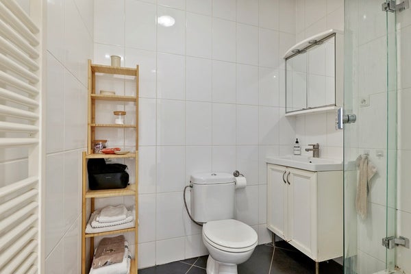 De badkamer bevindt zich naast de keuken en is in de basis netjes afgewerkt en voorzien van een inloopdouche, toilet en wastafelmeubel.