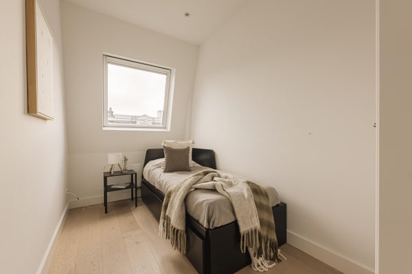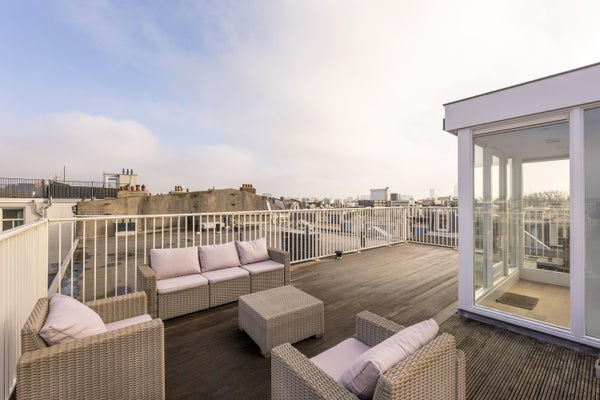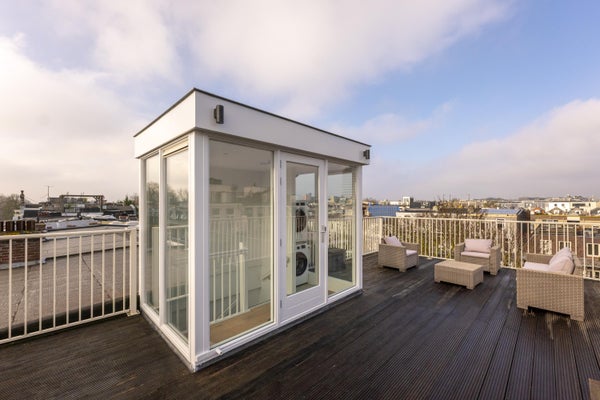 The roof terrace is exceptionally large at approximately 40 m², offering ample room for multiple seating areas, a dining table, and greenery. A wonderful private outdoor space with expansive city views, perfect for enjoying the sun throughout the day.