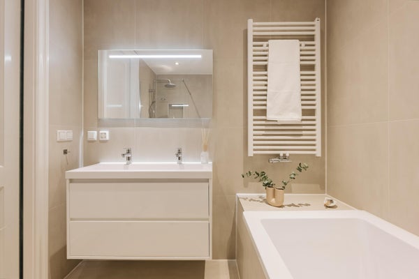 The bathroom is centrally located and fitted with a bathtub, washbasin, and walk-in shower. The toilet is separate and accessible from the landing. The central heating boiler is also located here, neatly concealed in a cupboard.