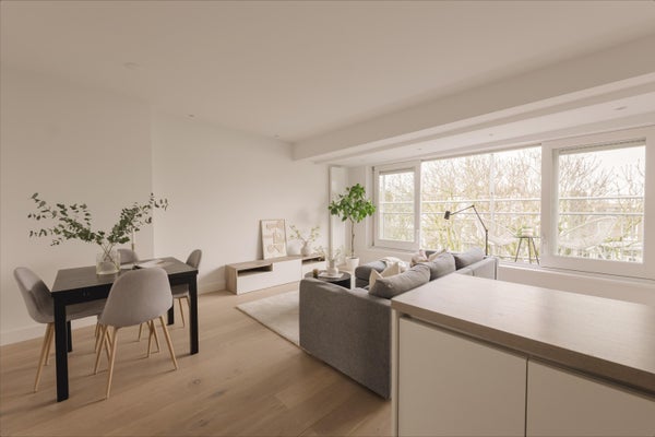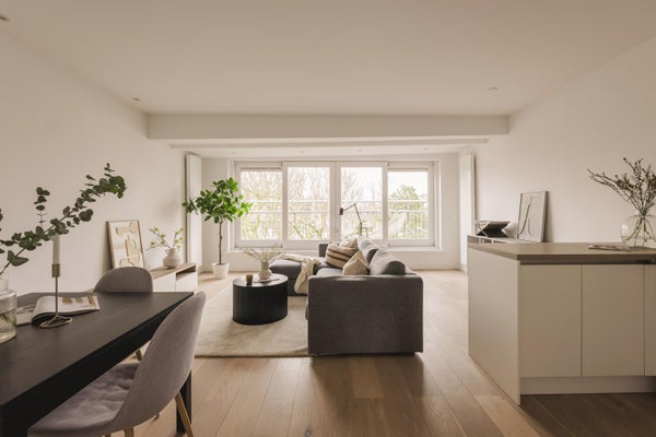 De centrale overloop geeft toegang tot alle vertrekken. Aan de achterzijde bevindt zich de lichte en ruime woonkamer met open keuken. De woonkamer heeft een prettige breedte en diepte en staat in directe verbinding met het balkon, dat over de volle breedte is gesitueerd en uitkijkt op groen en de stad. Dankzij de ligging op het noordwesten is er einde middag en avond zon. De open keuken is praktisch opgesteld en voorzien van diverse inbouwapparatuur. De indeling maakt het eenvoudig om een comfortabele zit- en eethoek te creëren. Het gehele appartement heeft in 2017 een totale metamorfose ondergaan en is toen volledig aangepast aan de moderne leef standaarden.