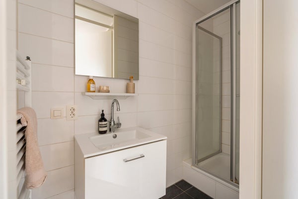De badkamer is compact en functioneel ingericht en voorzien van een douche en wastafelmeubel. Daarnaast is er een separaat toilet aanwezig en een inpandige berging!