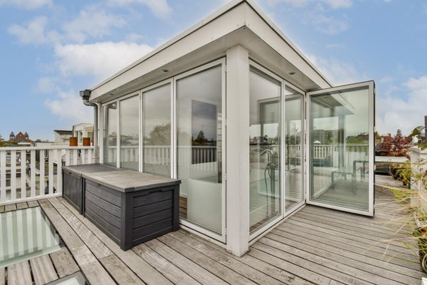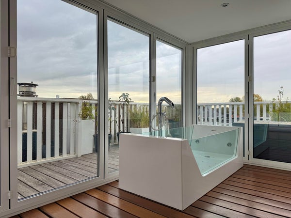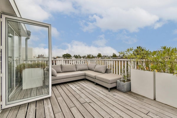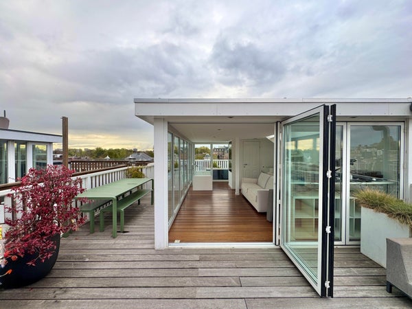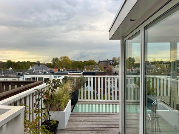 The fourth floor forms an exclusive rooftop extension with a wellness character, featuring a whirlpool bath, separate shower, second toilet and a multifunctional space. Fully opening glass folding doors provide access to the sunny rooftop terrace of 44 m². Above the terrace, an additional roof deck of 28 m² offers panoramic views over Oud-Zuid.