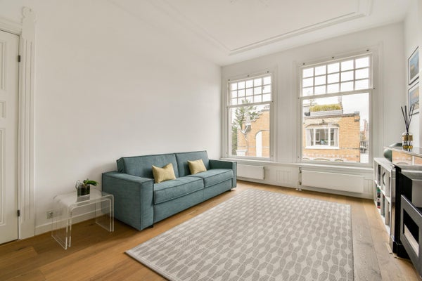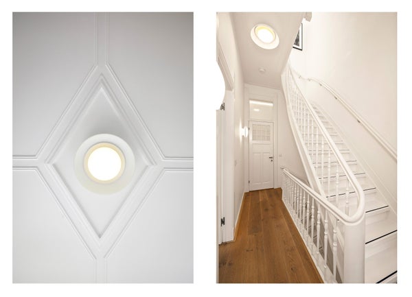 The private entrance at street level leads to the second floor, where the residence begins with a generous landing, a modern guest toilet and a bespoke wine climate cabinet. The living room is located at the front and features a fireplace and French doors opening onto a small balcony. At the rear, the dining room opens onto a spacious balcony overlooking the green inner gardens. The adjacent Siematic kitchen is equipped with high-quality built-in appliances by Siemens and Gaggenau, including an induction cooktop with integrated extraction, a Quooker and two combination ovens.