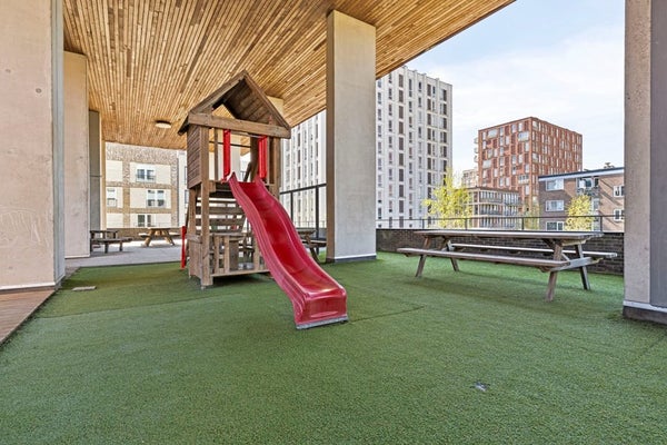 Bewoners hebben toegang tot een grote, gemeenschappelijke binnentuin met speeltuin en picknickplekken — een veilige en sociale omgeving voor gezinnen en buren.