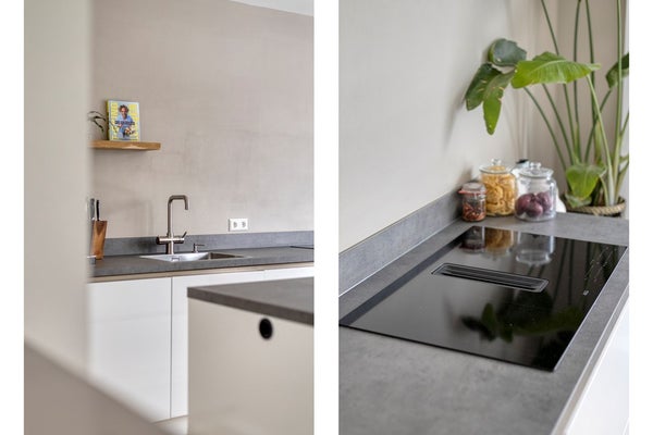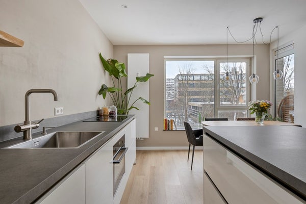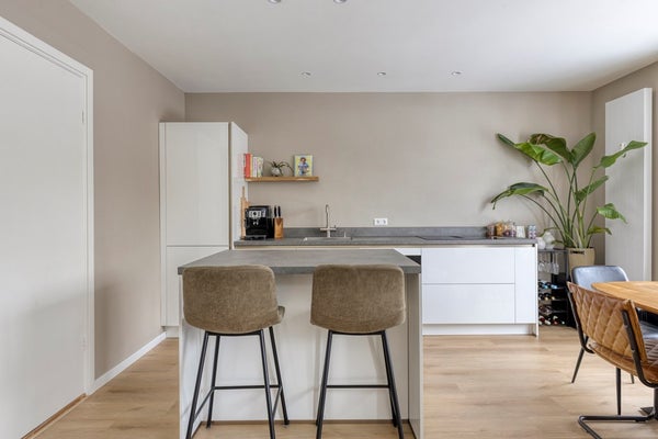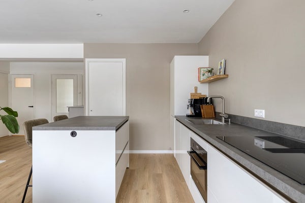 De moderne open keuken sluit naadloos aan op de woonkamer en is een echte blikvanger. Het langwerpige aanrechtblad en het eiland bieden volop werkruimte, terwijl de inductiekookplaat met afzuiging, spoelbak, vaatwasmachine, Howat heet-waterkraan en ingebouwde ovencombinatie zorgen voor optimaal kookcomfort. De strakke afwerking en de vele lades en kastjes bieden meer dan voldoende opbergruimte, waardoor functionaliteit en design hier perfect samenkomen.