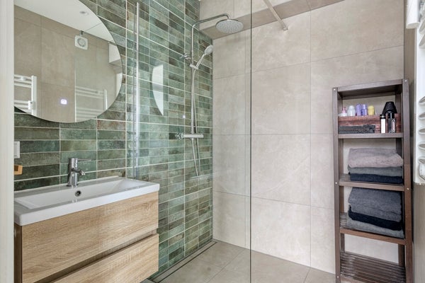 De badkamer is vanuit de slaapkamer bereikbaar en is volledig betegeld met een luxe natuurstenen afwerking. Hier vind je een ruime inloopdouche, een wastafel met spiegel en een handdoekradiator. De moderne uitstraling en verzorgde afwerking zorgen voor een hotelwaardig gevoel. Daarnaast beschikt de woning over een separate toiletruimte (vanuit de hal bereikbaar), wat extra comfort biedt.