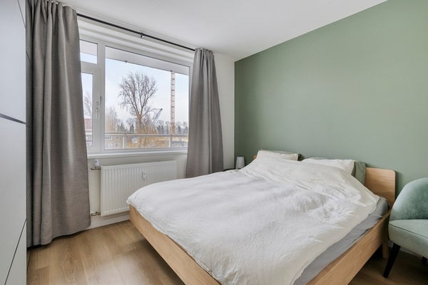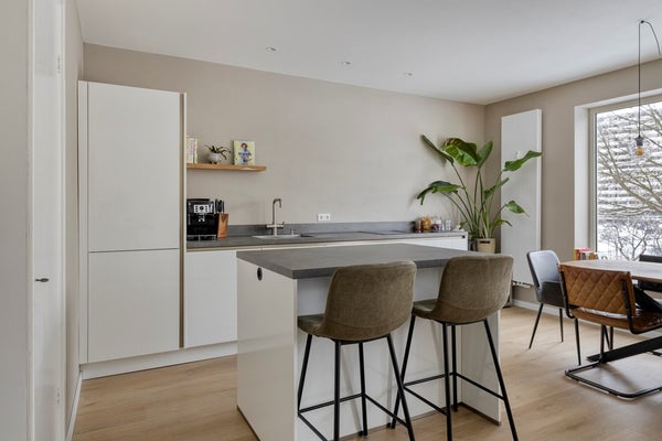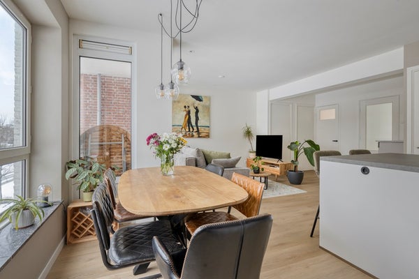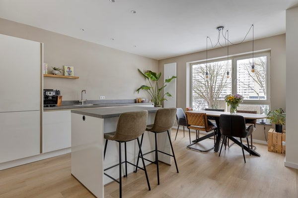 De woonkamer is ruim opgezet en baadt in het natuurlijke licht dankzij de grote raampartijen. Hier heb je alle vrijheid om een comfortabele zithoek en een gezellige eethoek te creëren, geheel naar je eigen smaak en woonwensen. De open indeling zorgt voor een fijne verbinding met de keuken, terwijl de deur naar het balkon het binnen- en buitenleven moeiteloos met elkaar verbindt. Dit is een ruimte waar je graag thuiskomt en waar ontspanning centraal staat.