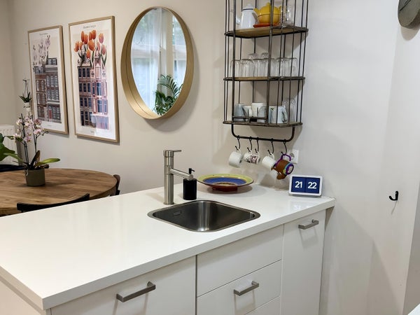 - De tussenverdieping heeft een woonoppervlakte van 38 m² en beschikt over 2 kamers, waarvan 1 slaapkamer;
