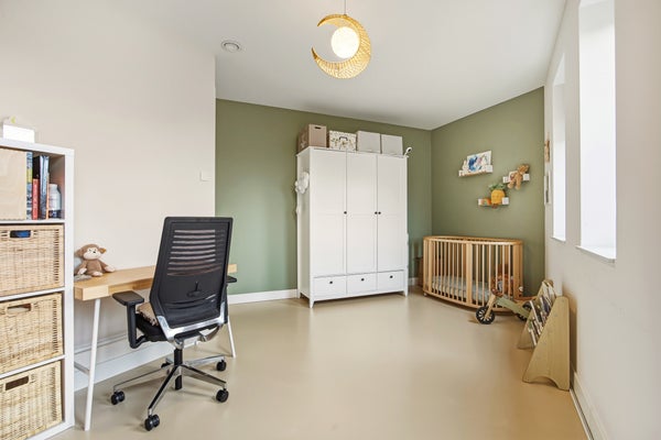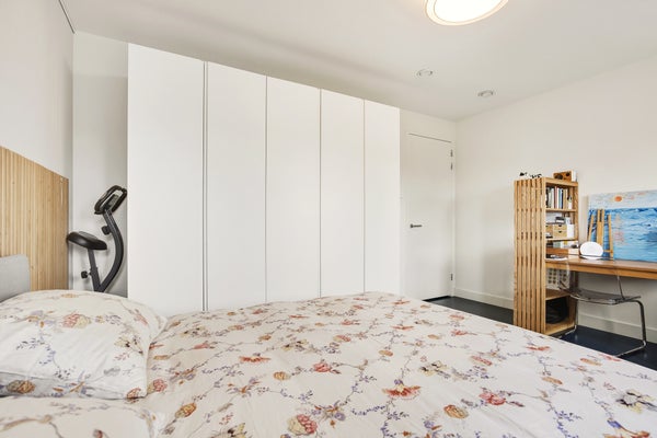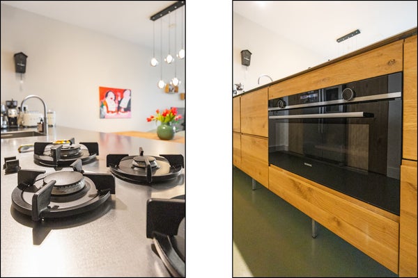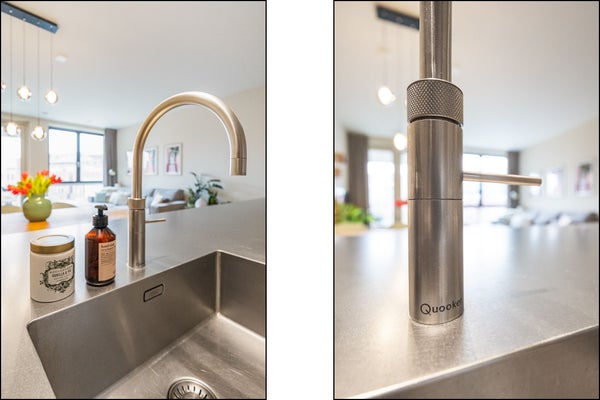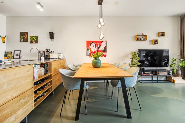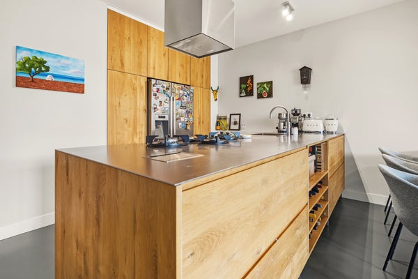 The bright living area with open-plan kitchen forms the heart of the home. The elegant cast floor with underfloor heating offers both comfort and a modern look. The luxurious kitchen features a stylish peninsula layout and is equipped with various built-in appliances, including an American fridge-freezer with ice maker, four-burner PITT Cooking gas hob, Quooker, large oven, dishwasher, extractor hood and ample cupboard space. French doors open onto the sunny southwest-facing terrace of approx. 9 m², a lovely spot to enjoy the sun well into the evening!